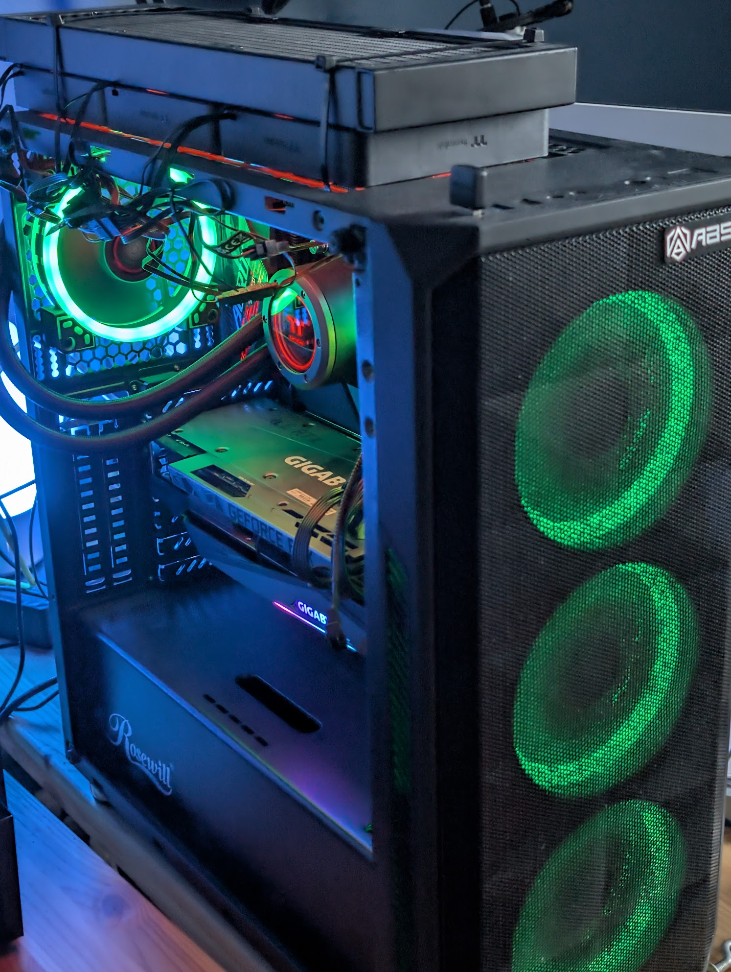One of my desktop stations that has become a bit of a Frankenstein Monster after replacing multiple components to keep it running. I change the light colors to match the season.